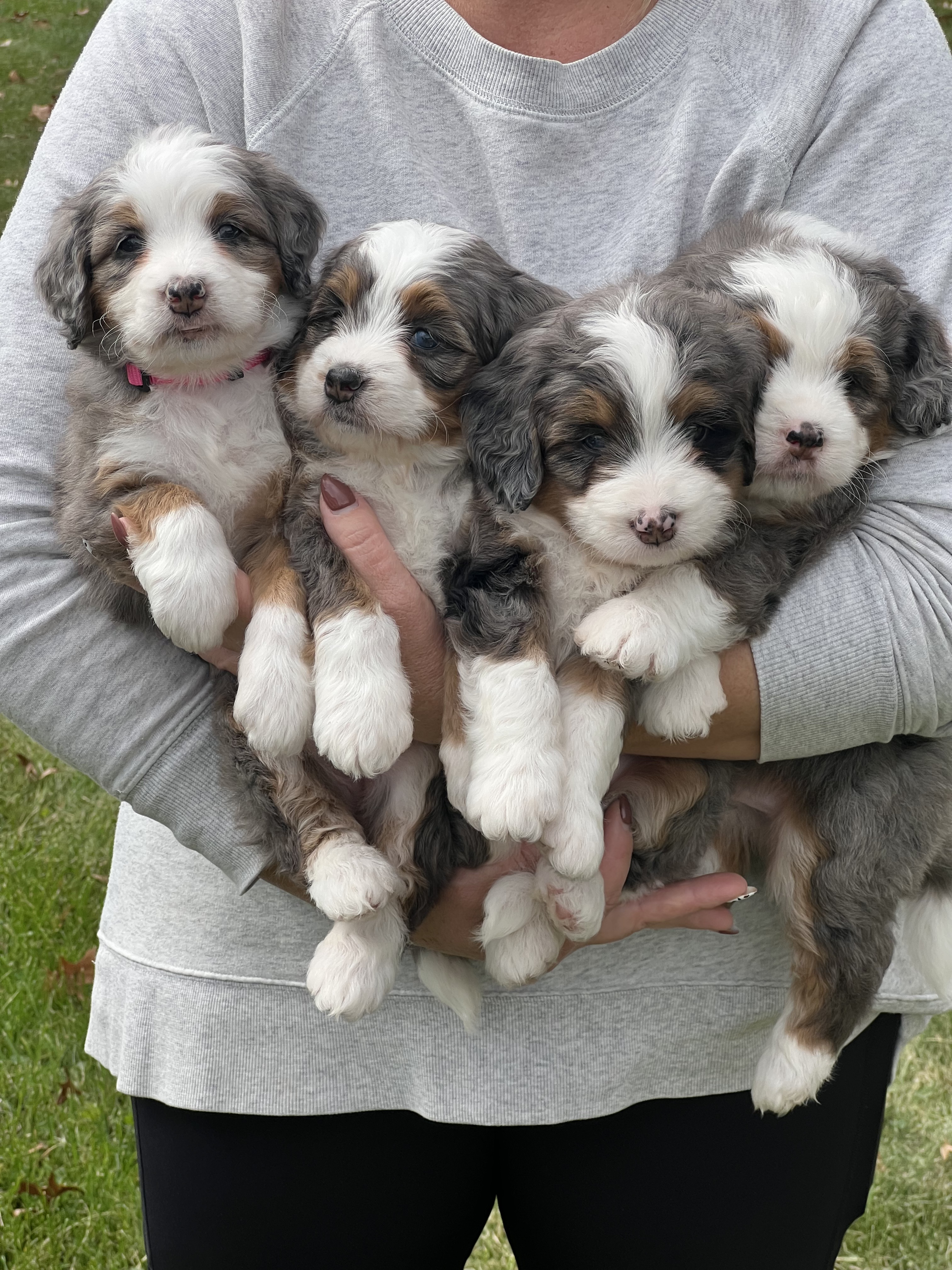 We are thrilled to announce the arrival of our Mini Bernedoodle puppies from Willow and Denali. These puppies are strikingly beautiful and have the loving, playful personalities that make this breed so special. Expected to reach about 30-35 pounds at maturity, they will require regular brushing, combing, and grooming, which is typical for all doodle breeds. As puppies, they will have moderate energy levels, but like their Bernese Mountain Dog lineage, they are likely to settle into a calm and laid-back temperament as they mature. Each puppy will come with a microchip, a blanket carrying the comforting scent of their mom and siblings, a birth certificate, vet records, their first round of vaccinations, a thorough vet check, toys, transition food, treats, and other accessories to ensure a smooth transition from our home to yours. To guarantee their safety and lifelong care, all our puppies require a contract before ownership is transferred, ensuring they remain out of shelters and rescues throughout their lives. We are confident that you will fall in love with our Mini Bernedoodle puppies, and they will bring joy and companionship to your family for many years to come.